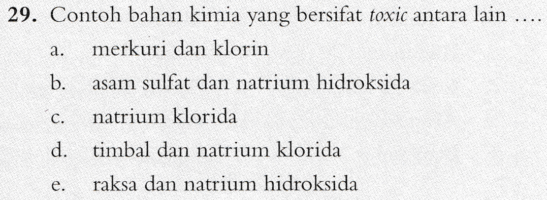 ... a. 29. Contoh bahan kimia yang bersifat toxic antara lain merkuri dan klorin b. asam sulfat dan natrium hidroksida c. natrium klorida d. timbal dan natrium klorida e. raksa dan natrium hidroksida