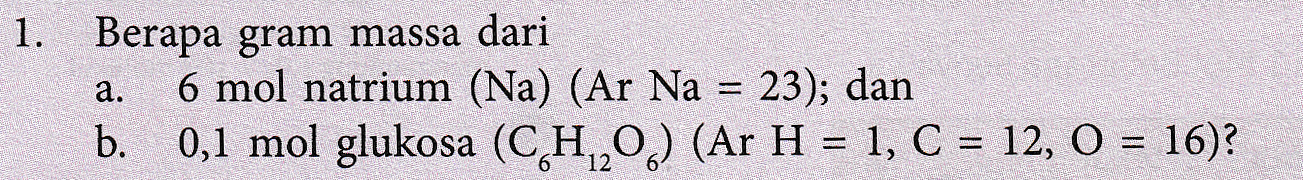 1. Berapa gram massa dari 6 mol natrium (Na) (Ar Na = 23); dan b. 0,1 mol glukosa (CH20) (Ar H = 1, C = 12, O = 16)? a.