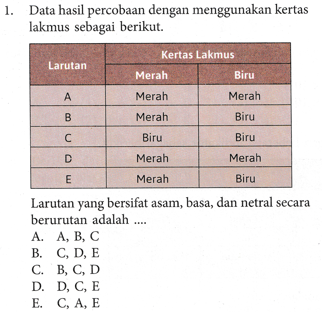 1. Data hasil percobaan dengan menggunakan kertas lakmus sebagai berikut. Kertas Lakmus Larutan Merah Biru А. Merah Merah B Merah Biru С. Biru Biru D Merah Merah E Merah Biru Larutan yang bersifat asam, basa, dan netral secara berurutan adalah .... A. A, B, C B. C, D, E C. B, C, D D. D, C, E E. C, A, E