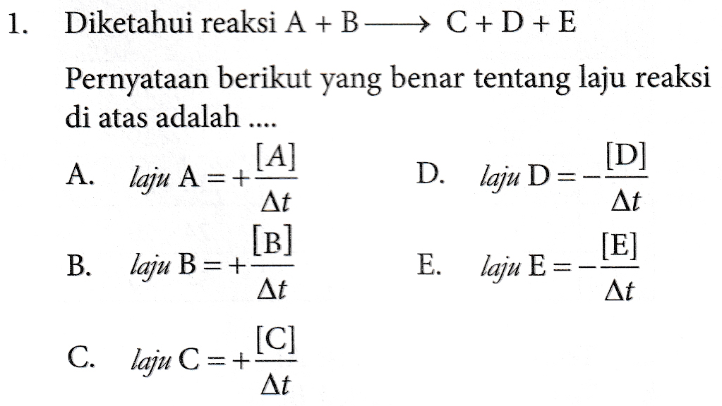 1. Diketahui reaksi A + B - C + D + E Pernyataan berikut yang benar tentang laju reaksi di atas adalah .... [A] [D] A. laju A=+ D. laju D At At [B] [E] B. laju B =+ E. laju E At At ---- [C] C. lau C =+ At
