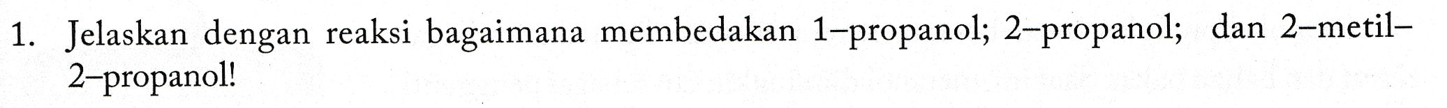 1. Jelaskan dengan reaksi bagaimana membedakan 1-propanol; 2-propanol; dan 2-metil- 2–propanol