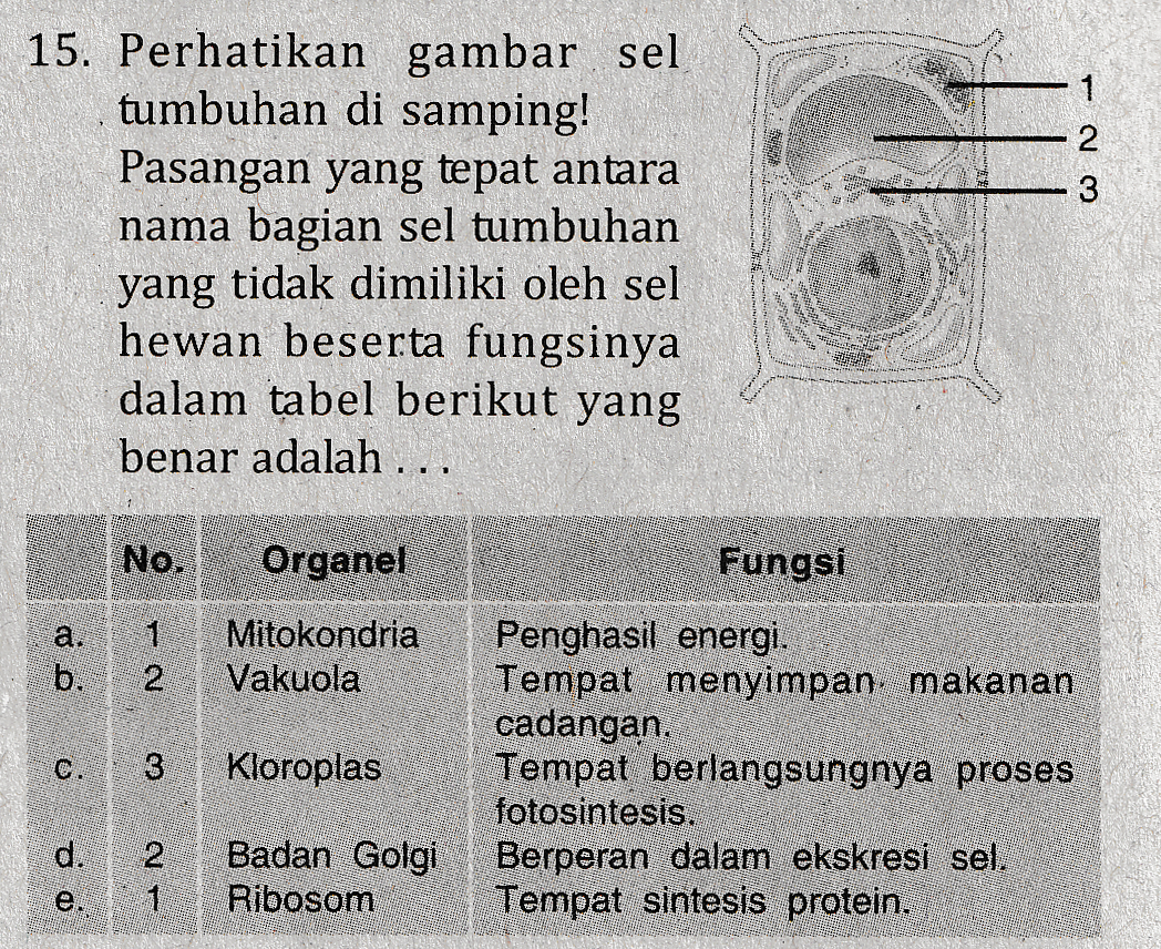 1 Nm 15. Perhatikan gambar sel tumbuhan di samping! Pasangan yang tepat antara nama bagian sel tumbuhan yang tidak dimiliki oleh sel hewan beserta fungsinya dalam tabel berikut yang benar adalah ... No. Organel Fungsi a. b. 1 2 Mitokondria Vakuola C. 3 Kloroplas Penghasil energi. Tempat menyimpan, makanan cadangan. Tempat berlangsungnya proses fotosintesis. Berperan dalam ekskresi sel. Tempat sintesis protein. d. e. 2 1 Badan Golgi Ribosom