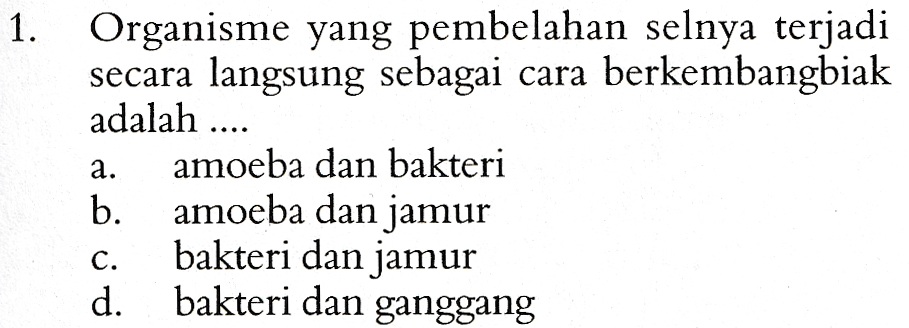 1. Organisme yang pembelahan selnya terjadi secara langsung sebagai cara berkembangbiak adalah .... amoeba dan bakteri b. amoeba dan jamur bakteri dan jamur d. bakteri dan ganggang a. C.