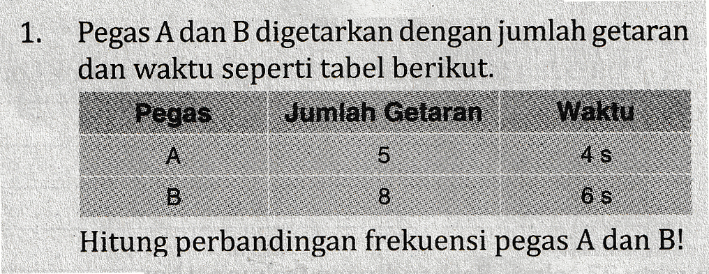 1. Pegas A dan B digetarkan dengan jumlah getaran dan waktu seperti tabel berikut. Pegas Jumlah Getaran Waktu А 5 4 s B 8 6 s Hitung perbandingan frekuensi pegas A dan B!