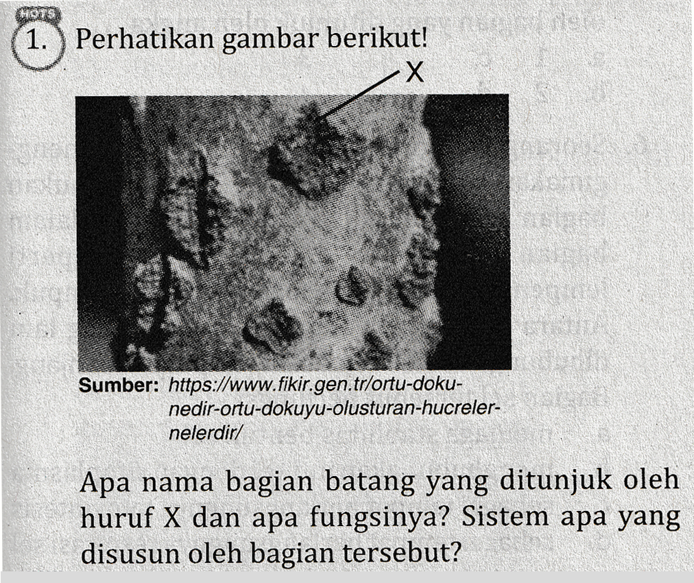 1.) Perhatikan gambar berikut! mere Х Sumber: https://www.fikir.gen.tr/ortu-doku- nedir-ortu-dokuyu-olusturan-hucreler- nelerdir/ Apa nama bagian batang yang ditunjuk oleh huruf X dan apa fungsinya? Sistem apa yang disusun oleh bagian tersebut?