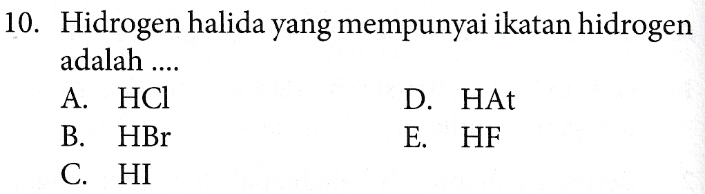 10. Hidrogen halida yang mempunyai ikatan hidrogen adalah .... A. HCl D. HAT B. HBr E. HF C. HI