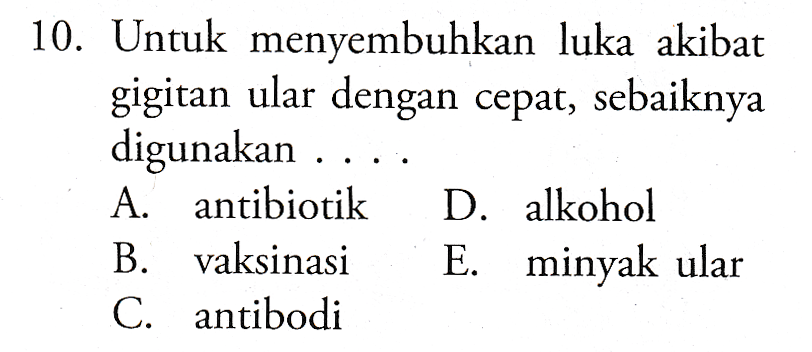 10. Untuk menyembuhkan luka akibat gigitan ular dengan cepat, sebaiknya digunakan A. antibiotik D. alkohol B. vaksinasi E. minyak ular C. antibodi