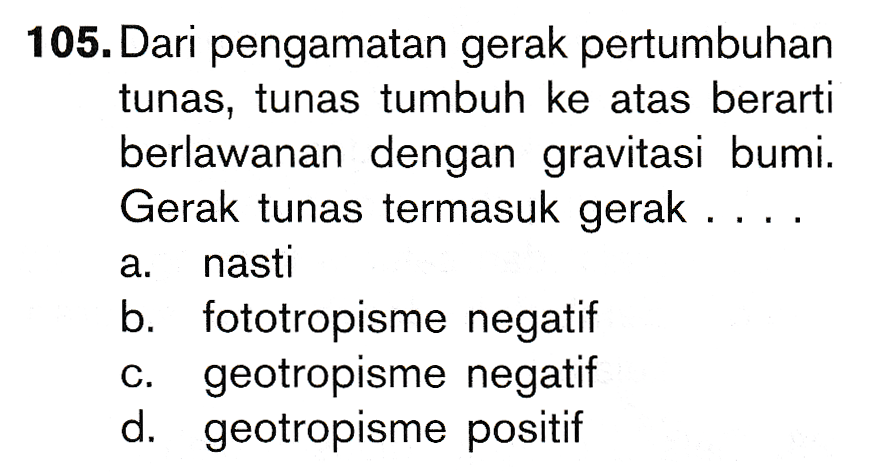 105. Dari pengamatan gerak pertumbuhan tunas, tunas tumbuh ke atas berarti berlawanan dengan gravitasi bumi. Gerak tunas termasuk gerak nasti b. fototropisme negatif c. geotropisme negatif d. geotropisme positif a.