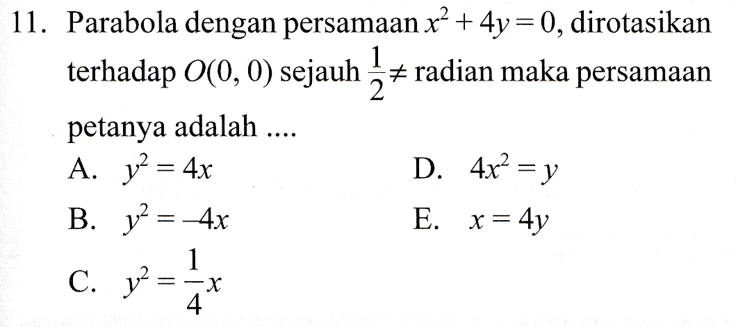 11. Parabola dengan persamaan x² + 4y= 0, dirotasikan terhadap 0(0,0) sejauh 2+ radian maka persamaan petanya adalah .... A. y2 = 4x D. 4x² = y B. y2 = -4x E. x = 4y C. y2 1 X 4