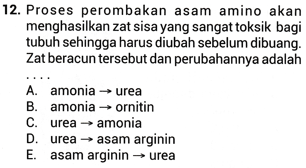 12. Proses perombakan asam amino akan menghasilkan zat sisa yang sangat toksik bagi tubuh sehingga harus diubah sebelum dibuang. Zat beracun tersebut dan perubahannya adalah A. amonia → urea B. amonia → ornitin C. urea → amonia D. urea → asam arginin E. asam arginin → urea