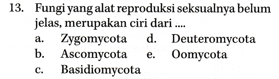 13. Fungi yang alat reproduksi seksualnya belum jelas, merupakan ciri dari .... Zygomycota d. Deuteromycota b. Ascomycota Oomycota Basidiomycota a. e. C.