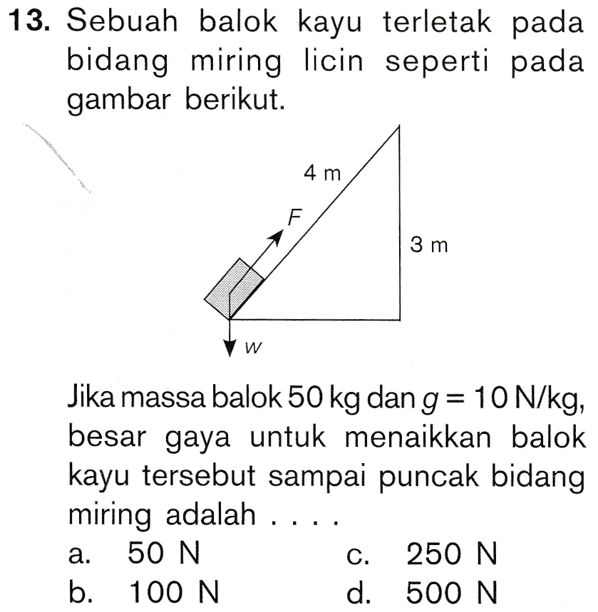 13. Sebuah balok kayu terletak pada bidang miring licin seperti pada gambar berikut. 4 m F 3 m W Jika massa balok 50 kg dang= 10 N/kg, besar gaya untuk menaikkan balok kayu tersebut sampai puncak bidang miring adalah .... a. 50 N 250 N b. 100 N. d. 500 N C.