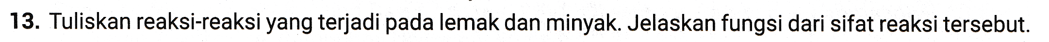 13. Tuliskan reaksi-reaksi yang terjadi pada lemak dan minyak. Jelaskan fungsi dari sifat reaksi tersebut.