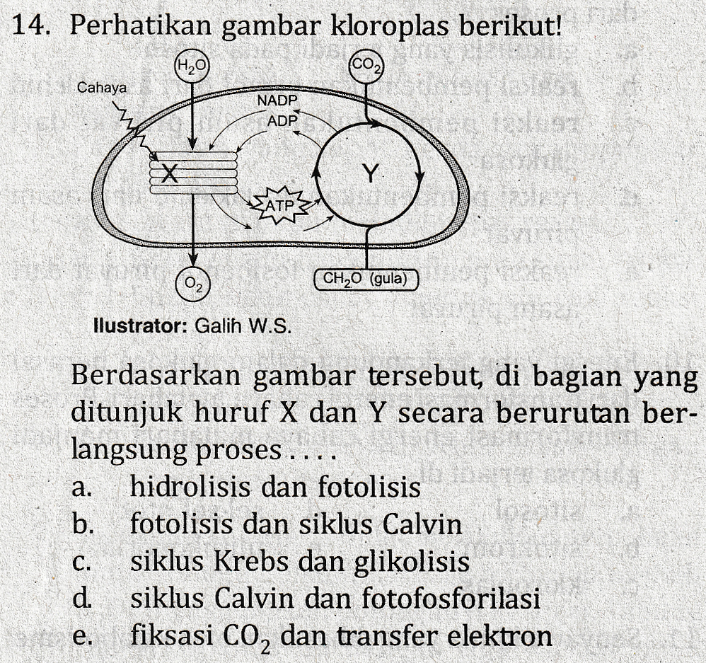 14. Perhatikan gambar kloroplas berikut! (H20) CO, Cahaya NADP ADP * Y. 2АТР CH20 (gula) llustrator: Galih W.S. Berdasarkan gambar tersebut, di bagian yang ditunjuk huruf X dan Y secara berurutan ber- langsung proses.... a. hidrolisis dan fotolisis b. fotolisis dan siklus Calvin tot siklus Krebs dan glikolisis d. siklus Calvin dan fotofosforilasi fiksasi CO2 dan transfer elektron C. e.