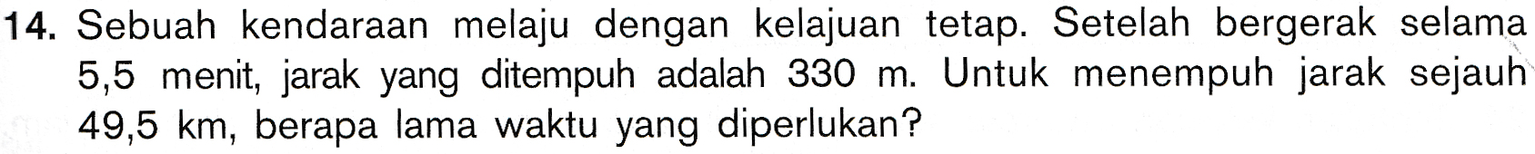 14. Sebuah kendaraan melaju dengan kelajuan tetap. Setelah bergerak selama 5,5 menit, jarak yang ditempuh adalah 330 m. Untuk menempuh jarak sejauh 49,5 km, berapa lama waktu yang diperlukan?