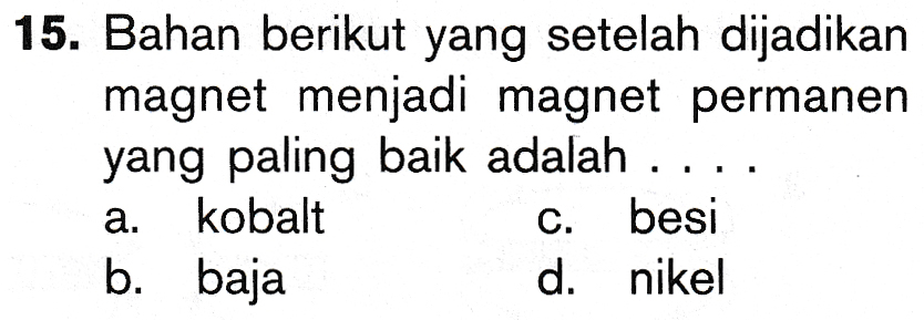 15. Bahan berikut yang setelah dijadikan magnet menjadi magnet permanen yang paling baik adalah . kobalt besi b. baja d. nikel a. C.