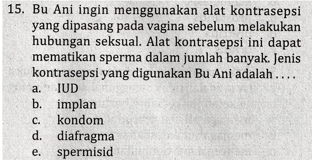 15. Bu Ani ingin menggunakan alat kontrasepsi yang dipasang pada vagina sebelum melakukan hubungan seksual. Alat kontrasepsi ini dapat mematikan sperma dalam jumlah banyak. Jenis kontrasepsi yang digunakan Bu Ani adalah .... IUD b. implan kondom d. diafragma spermisid a. C. e.