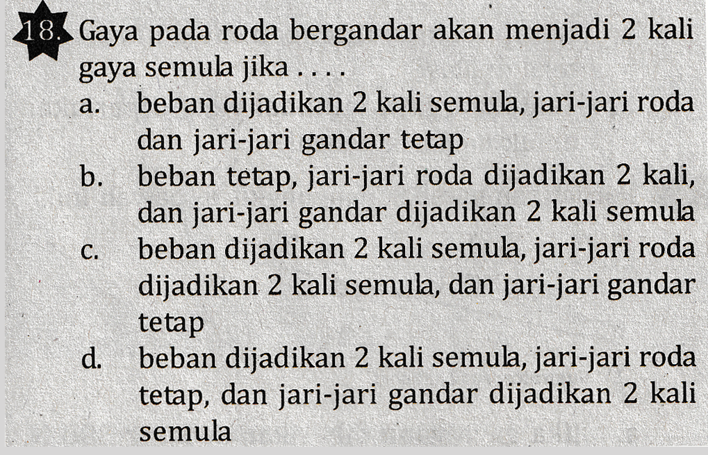 18. Gaya pada roda bergandar akan menjadi 2 kali gaya semula jika .... a. beban dijadikan 2 kali semula, jari-jari roda dan jari-jari gandar tetap b. beban tetap, jari-jari roda dijadikan 2 kali, dan jari-jari gandar dijadikan 2 kali semula C. beban dijadikan 2 kali semula, jari-jari roda dijadikan 2 kali semula, dan jari-jari gandar tetap d. beban dijadikan 2 kali semula, jari-jari roda tetap, dan jari-jari gandar dijadikan 2 kali semula