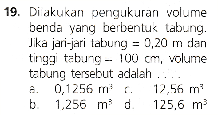 19. Dilakukan pengukuran volume benda yang berbentuk tabung. Jika jari-jari tabung = 0,20 m dan tinggi tabung = 100 cm, volume tabung tersebut adalah .... 0,1256 m3 C. 12,56 m3 b. 1,256 m3 d. 125,6 m3 a.