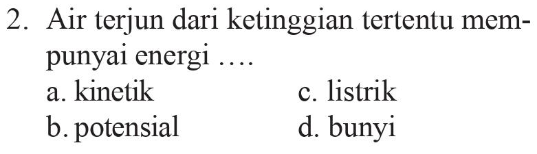 2. Air terjun dari ketinggian tertentu mem- punyai energi ... a. kinetik c. listrik b. potensial d. bunyi