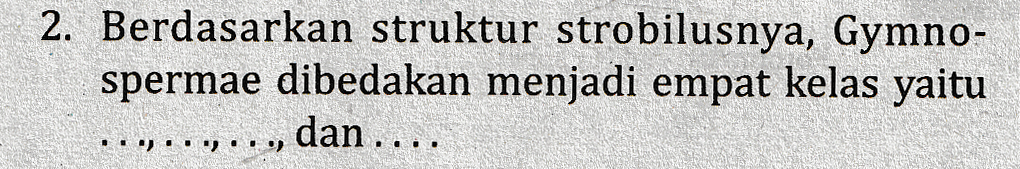 2. Berdasarkan struktur strobilusnya, Gymno- spermae dibedakan menjadi empat kelas yaitu dan .... ...) ..:))