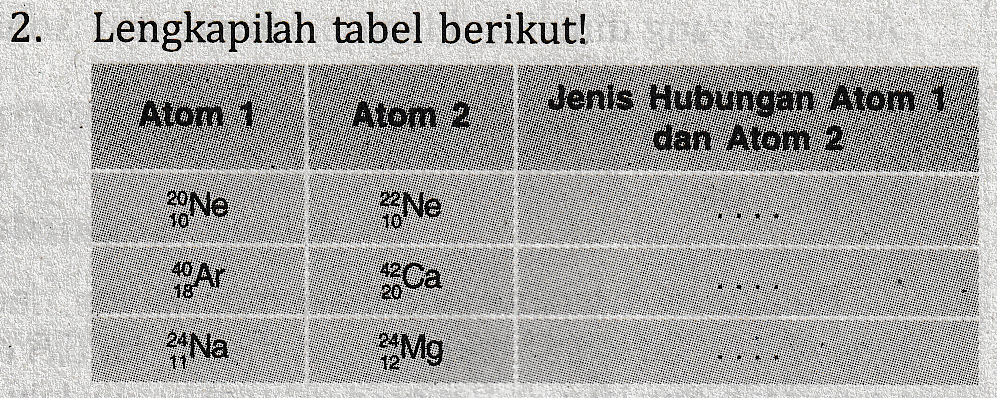 2. Lengkapilah tabel berikut! Atom 1 Atom 2 Jenis Hubungan Atom 1 dan Atom 2 Ne Ne Ar ca 18 24Na Mg