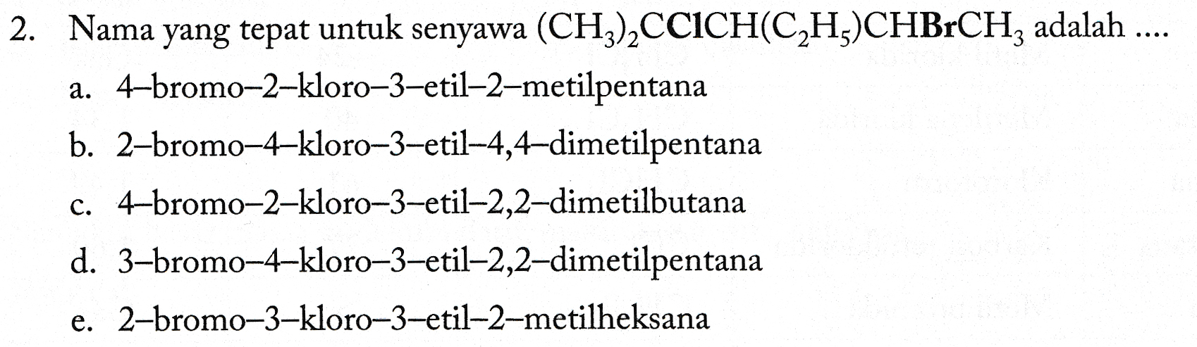 2. Nama yang tepat untuk senyawa (CH3)2CCICH(C2H5)CHBrCHZ adalah .... a. 4-bromo-2-kloro–3–etil-2-metilpentana b. 2-bromo-4-kloro-3-etil-4,4-dimetilpentana c. 4-bromo-2-kloro-3-etil-2,2-dimetilbutana d. 3-bromo-4-kloro-3-etil-2,2-dimetilpentana e. 2-bromo-3-kloro-3-etil-2-metilheksana
