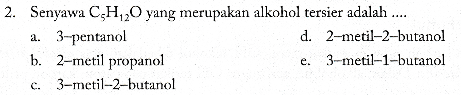 2. Senyawa C-H120 yang merupakan alkohol tersier adalah .... a. 3-pentanol d. 2-metil-2-butanol b. 2-metil propanol 3-metil-1-butanol 3-metil-2-butanol e. C.