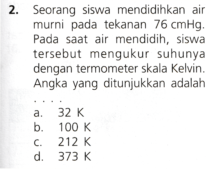 2. Seorang siswa mendidihkan air murni pada tekanan 76 cmHg. Pada saat air mendidih, siswa tersebut mengukur suhunya dengan termometer skala Kelvin. Angka yang ditunjukkan adalah a. 32 K b. 100 K C. 212 K d. 373 K