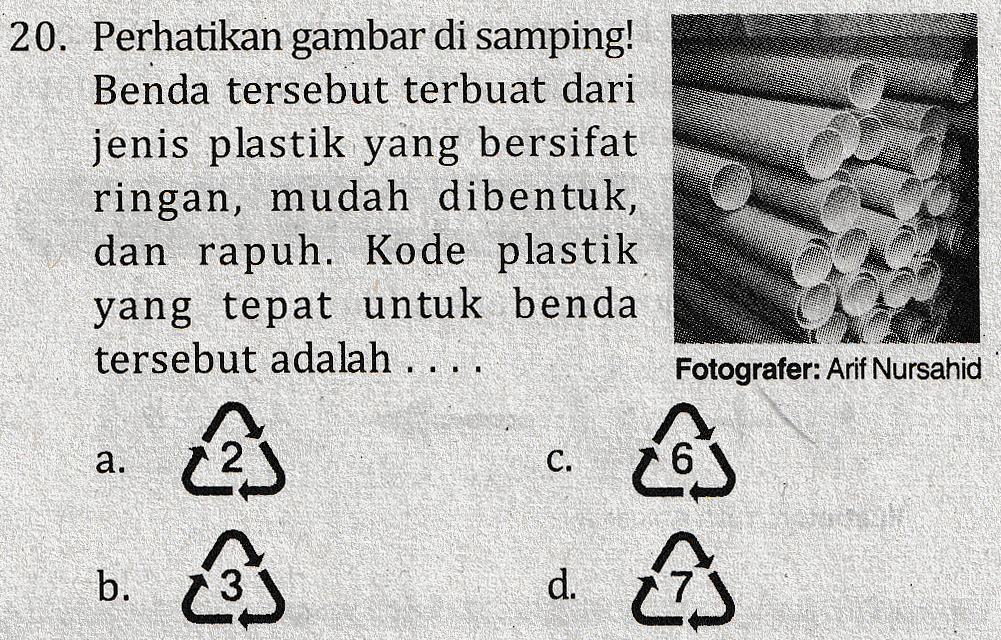 20. Perhatikan gambar di samping! Benda tersebut terbuat dari jenis plastik yang bersifat ringan, mudah dibentuk, dan rapuh. Kode plastik yang tepat untuk benda tersebut adalah .... Fotografer: Arif Nursahid a. C. دي ده دی ده b. d.