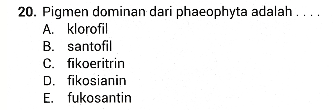 20. Pigmen dominan dari phaeophyta adalah .... A. klorofil B. santofil C. fikoeritrin D. fikosianin E. fukosantin