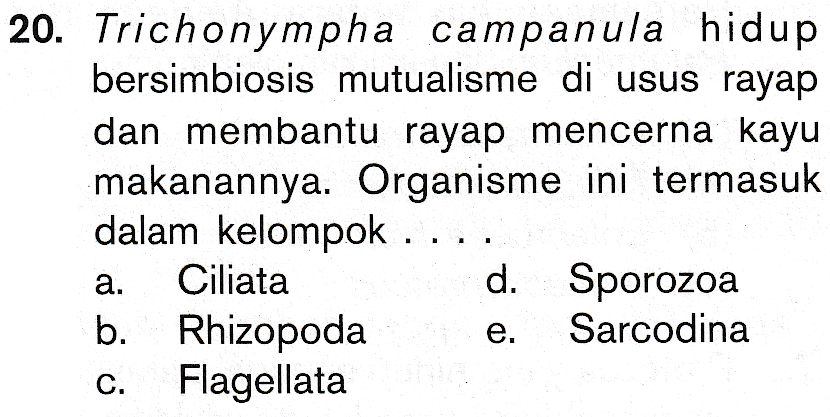 20. Trichonympha campanula hidup bersimbiosis mutualisme di usus rayap dan membantu rayap mencerna kayu makanannya. Organisme ini termasuk dalam kelompok Ciliata d. Sporozoa b. Rhizopoda Sarcodina Flagellata e.