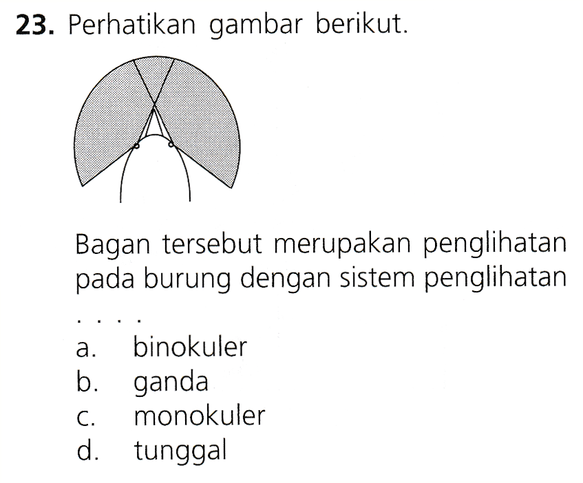23. Perhatikan gambar berikut. Bagan tersebut merupakan penglihatan pada burung dengan sistem penglihatan a. binokuler b. ganda C. monokuler d. tunggal