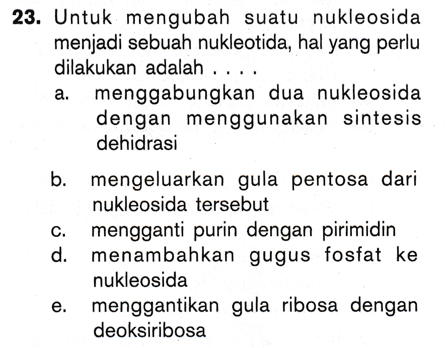 23. Untuk mengubah suatu nukleosida menjadi sebuah nukleotida, hal yang perlu dilakukan adalah .... menggabungkan dua nukleosida dengan menggunakan sintesis dehidrasi a. C. b. mengeluarkan gula pentosa dari nukleosida tersebut mengganti purin dengan pirimidin d. menambahkan gugus fosfat ke nukleosida menggantikan gula ribosa dengan deoksiribosa e.
