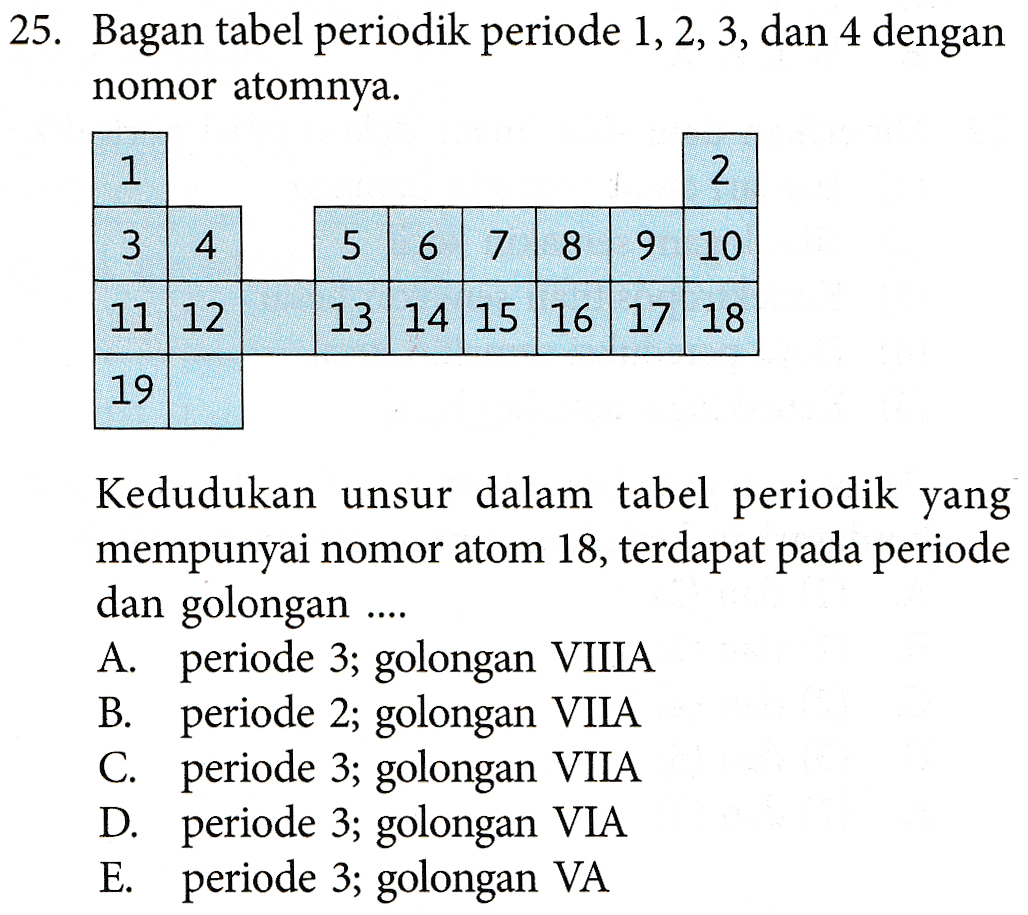 25. Bagan tabel periodik periode 1, 2, 3, dan 4 dengan nomor atomnya. 1 2 2 3 4 5 6 7 8 9 10 7 11 12 13 14 15 16 17 18 19 Kedudukan unsur dalam tabel periodik yang mempunyai nomor atom 18, terdapat pada periode dan golongan A. periode 3; golongan VIIIA B. periode 2; golongan VIIA C. periode 3; golongan VIIA D. periode 3; golongan VIA periode 3; golongan VA E.