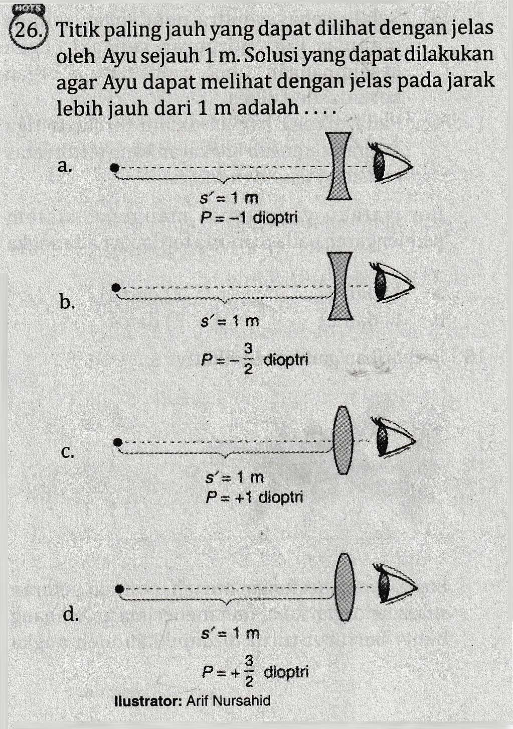26.) Titik paling jauh yang dapat dilihat dengan jelas oleh Ayu sejauh 1 m. Solusi yang dapat dilakukan agar Ayu dapat melihat dengan jelas pada jarak lebih jauh dari 1 m adalah .... a. s'= 1 m P=-1 dioptri I ID b. s'= 1 m 3 P=- dioptri Oo c . s'= 1 m P= +1 dioptri li d. s'=1m 3 dioptri 2 llustrator: Arif Nursahid P=+