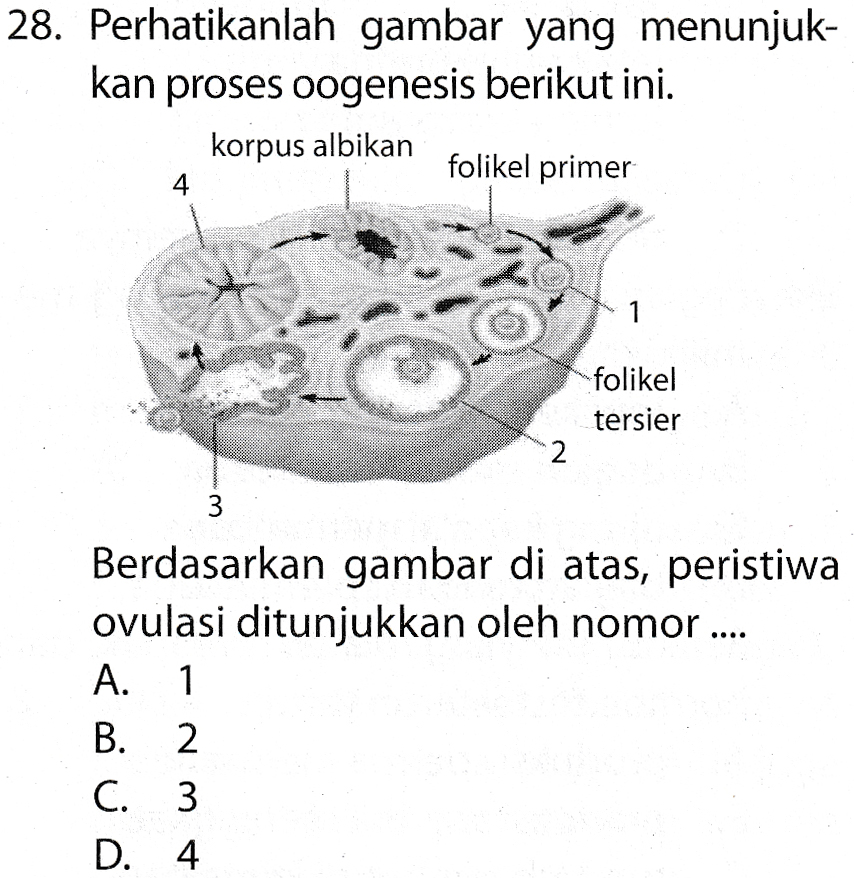 28. Perhatikanlah gambar yang menunjuk- kan proses oogenesis berikut ini. korpus albikan folikel primer 4 1 folikel tersier 2 3 Berdasarkan gambar di atas, peristiwa ovulasi ditunjukkan oleh nomor .... A. 1 B. 2 C. 3 D. 4