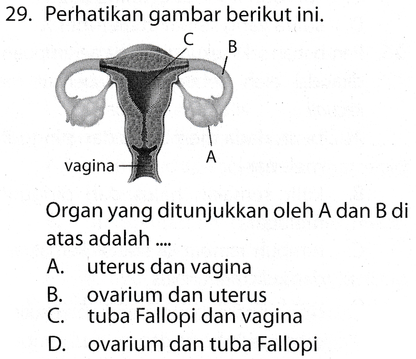 29. Perhatikan gambar berikut ini. C С B A vagina Organ yang ditunjukkan oleh A dan B di atas adalah .... A. uterus dan vagina B. ovarium dan uterus C. tuba Fallopi dan vagina D. ovarium dan tuba Fallopi