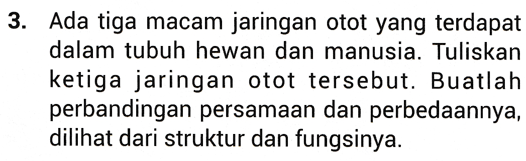3. Ada tiga macam jaringan otot yang terdapat dalam tubuh hewan dan manusia. Tuliskan ketiga jaringan otot tersebut. Buatlah perbandingan persamaan dan perbedaannya, dilihat dari struktur dan fungsinya.