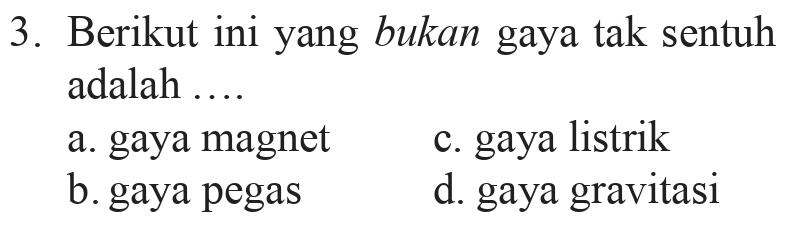3. Berikut ini yang bukan gaya tak sentuh adalah .... a. gaya magnet b. gaya pegas d. gaya gravitasi c. gaya listrik
