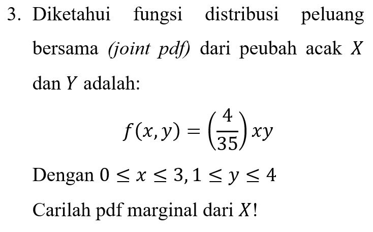 3. Diketahui fungsi distribusi peluang bersama (joint pdf) dari peubah acak X dan Y adalah: f(x,y) = (33) ху Dengan 0 < x < 3,1 <y < 4 Carilah pdf marginal dari X!