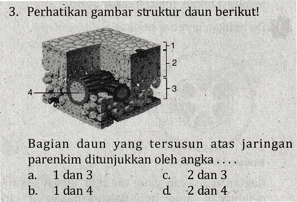3. Perhatikan gambar struktur daun berikut! 1-1 2 3 .... Bagian daun yang tersusun atas jaringan parenkim ditunjukkan oleh angka ... 1 dan 3 C: 2 dan 3 b. 1 dan 4 d. 2 dan 4 0 1 dan