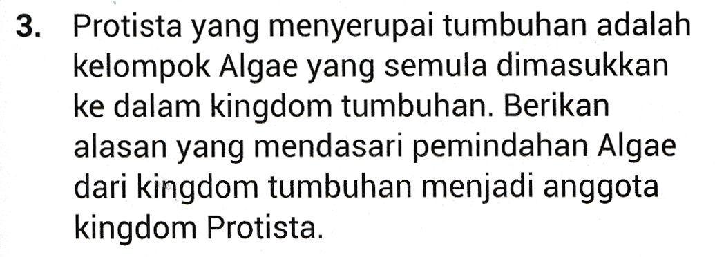 3. Protista yang menyerupai tumbuhan adalah kelompok Algae yang semula dimasukkan ke dalam kingdom tumbuhan. Berikan alasan yang mendasari pemindahan Algae dari kingdom tumbuhan menjadi anggota kingdom Protista.