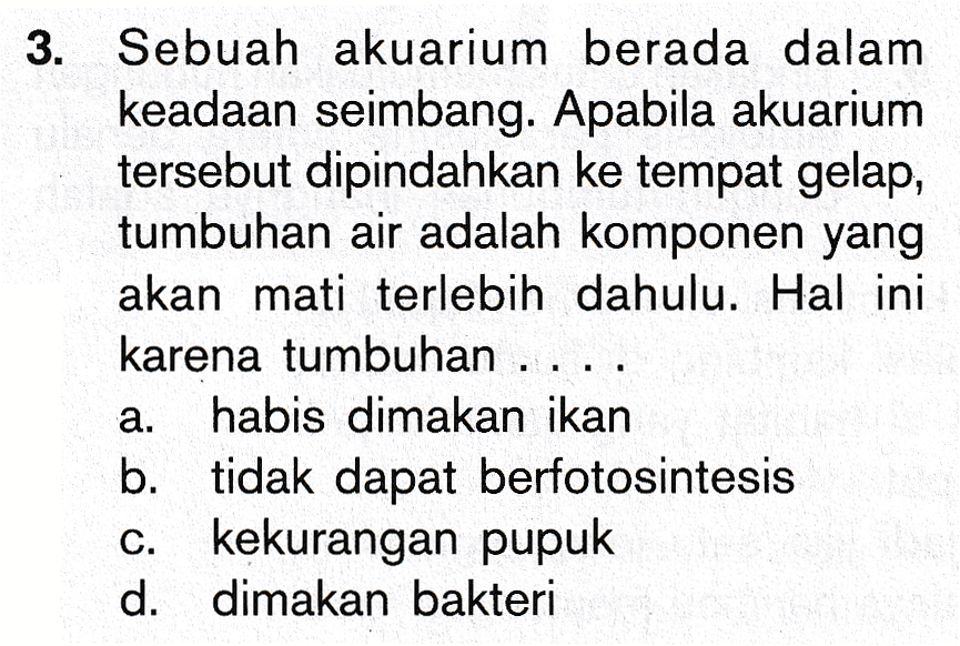 3. Sebuah akuarium berada dalam keadaan seimbang. Apabila akuarium tersebut dipindahkan ke tempat gelap, tumbuhan air adalah komponen yang akan mati terlebih dahulu. Hal ini karena tumbuhan habis dimakan ikan b. tidak dapat berfotosintesis c. kekurangan pupuk d. dimakan bakteri . a.