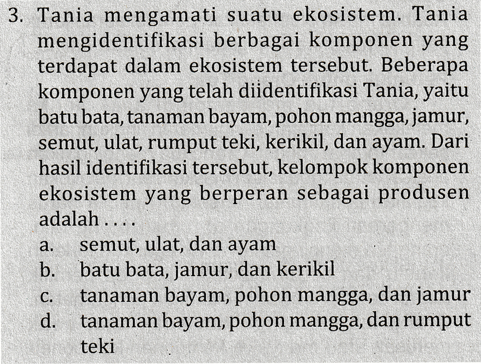 3. Tania mengamati suatu ekosistem. Tania mengidentifikasi berbagai komponen yang terdapat dalam ekosistem tersebut. Beberapa komponen yang telah diidentifikasi Tania, yaitu batu bata, tanaman bayam, pohon mangga, jamur, semut, ulat, rumput teki, kerikil, dan ayam. Dari hasil identifikasi tersebut, kelompok komponen ekosistem yang berperan sebagai produsen adalah .... semut, ulat, dan ayam b. batu bata, jamur, dan kerikil tanaman bayam, pohon mangga, dan jamur d. tanaman bayam, pohon mangga, dan rumput teki a. C.