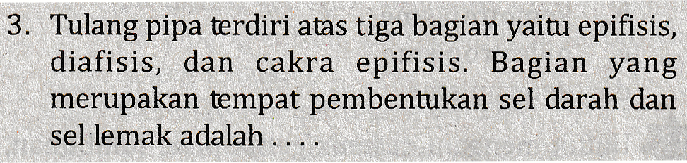 3. Tulang pipa terdiri atas tiga bagian yaitu epifisis, diafisis, dan cakra epifisis. Bagian yang merupakan tempat pembentukan sel darah dan sel lemak adalah ....