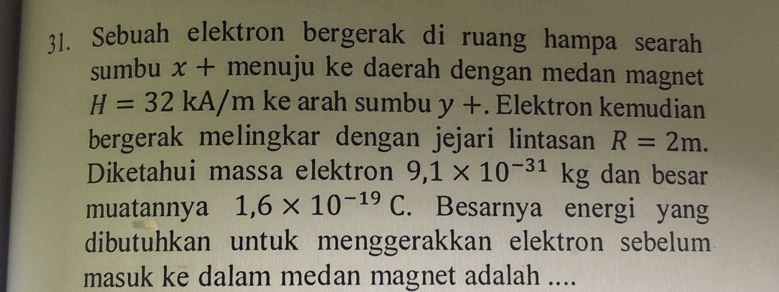 31. Sebuah elektron bergerak di ruang hampa searah sumbu x + menuju ke daerah dengan medan magnet H = 32 kA/m ke arah sumbu y +. Elektron kemudian bergerak melingkar dengan jejari lintasan R = 2m. Diketahui massa elektron 9,1 x 10-31 kg dan besar muatannya 1,6 x 10-19 C. Besarnya energi yang dibutuhkan untuk menggerakkan elektron sebelum masuk ke dalam medan magnet adalah ....