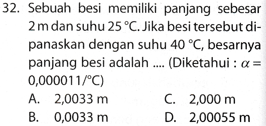 32. Sebuah besi memiliki panjang sebesar 2m dan suhu 25 °C. Jika besi tersebut di- panaskan dengan suhu 40 °C, besarnya panjang besi adalah .... (Diketahui : a= 0,000011/°C) A. 2,0033 m C. 2,000 m B. 0,0033 m D. 2,00055 m