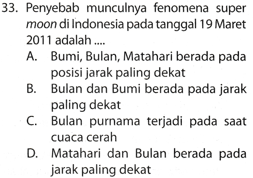33. Penyebab munculnya fenomena super moon di Indonesia pada tanggal 19 Maret 2011 adalah ... A. Bumi, Bulan, Matahari berada pada posisi jarak paling dekat B. Bulan dan Bumi berada pada jarak paling dekat C. Bulan purnama terjadi pada saat cuaca cerah D. Matahari dan Bulan berada pada jarak paling dekat