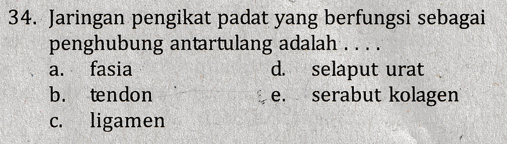 34. Jaringan pengikat padat yang berfungsi sebagai penghubung antartulang adalah .... fasia d. selaput urat b. tendon e. serabut kolagen C. ligamen a.